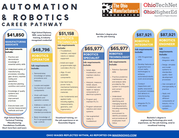 RAMTEC’s mission is to provide a technically trained, highly skilled workforce to promote the creation and expansion of business and industry through robotics and advanced manufacturing technologies. Ohio has a rich history in manufacturing, which will be a significant part of our future as well. Today it involves robotics, computer-aided machinery, and technology to improve products and processes. Across the United States there are over 1.5 million manufacturing jobs that need to be filled with highly skilled workers. The number of unfilled jobs increases by 500 thousand every year, according to the U.S. Bureau of Labor Statistics. RAMTEC provides real life experience practicing on industrial robots, preparing students to be the best of the best out in the field.
